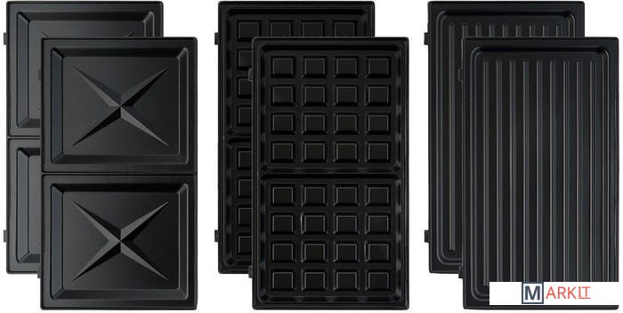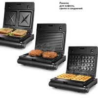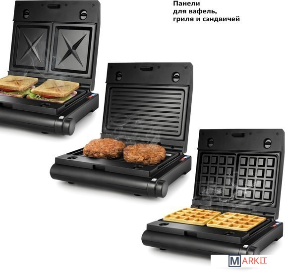 Комплектация ГрильСменные панели:- для гриля (установлены в устройство) - 2 шт- для сэндвичей - 2 шт- для вафель - 2 штРуководство по эксплуатации